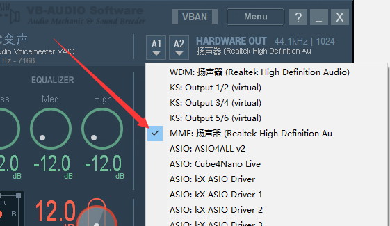 第二步,打开RVC变声驱动程序,并选择输出的AI通道,为电脑集成声卡默认扬声器,下图红色部分,经过研究应该走MME开头才是正确的,如下图;