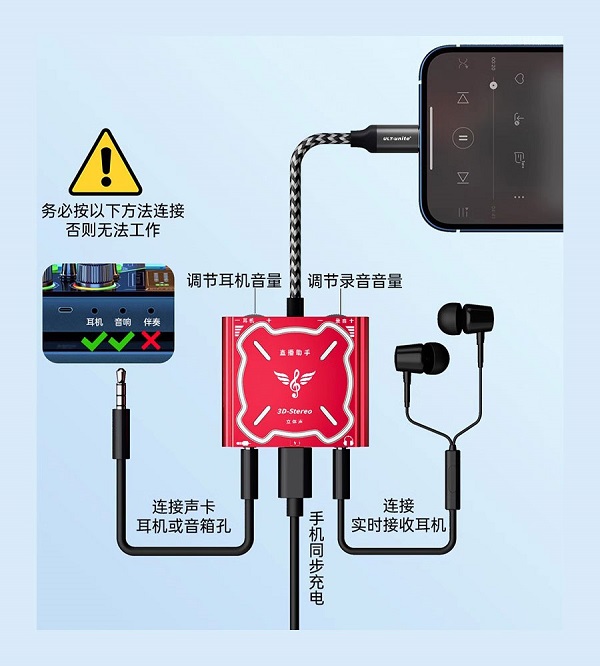 2、通过一条苹果或者安卓线,连接到手机的充电口,然后耳机则插到,转换器的耳机图标输出口;