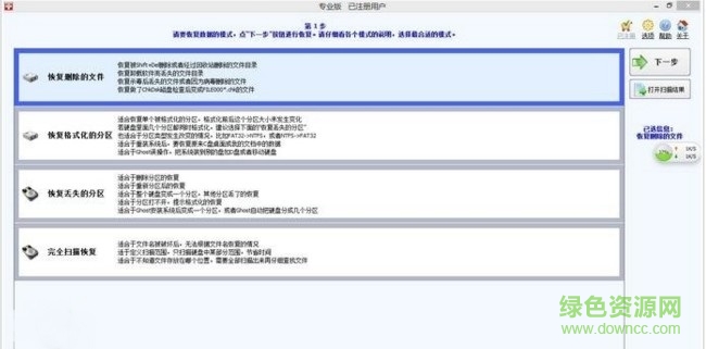 第一步:选择要恢复数据的模式,点“下一步”按钮进行恢复
