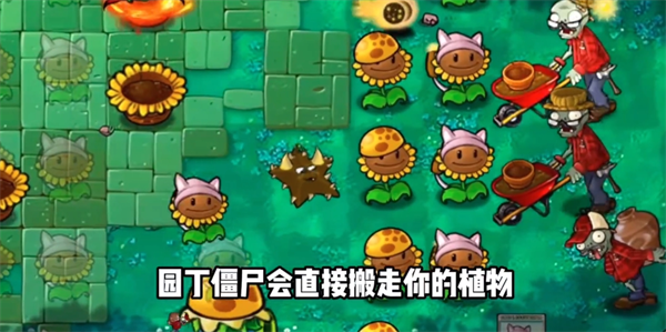 2、新出现的园丁僵尸更是离谱,他们会推着自己的小推车偷走第一个遇到的植物,但是失去车子速度会变慢哦;