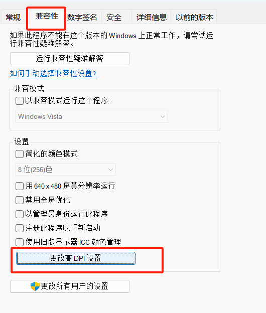 2、在菜单中选择属性,选中【兼容性】,点击最下面的【更改高DPI设置】;