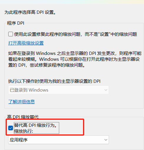 3、将【代替高DPI缩放行为】勾选上,重新打开游戏,设置全屏即可。