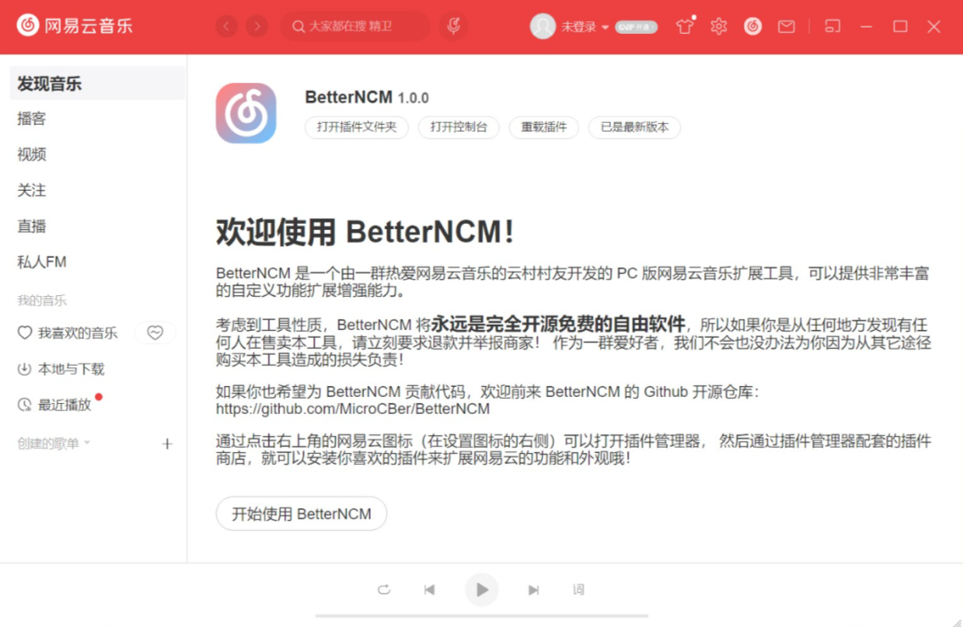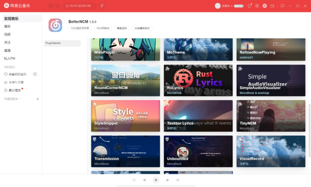 3、再次打开网易云音乐,安装成功上面功能栏会多一个按钮,点击即可看见插件管理界面;