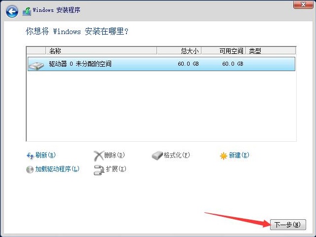 选择磁盘,我这里只有一个空磁盘,就选择了。但如果有多块硬盘,一定要注意,gpt=uefi,mbr-bios