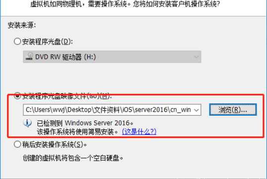 首先,使用虚拟光驱或者刻录光盘载入如镜像文件运行,比如用vm(电脑没有安装的,请点击下方链接。),创建新的虚拟机,一直点击下一步就可以了,映像文件我们这边选择server2016(注:以iso结尾的文件)点击下一步。