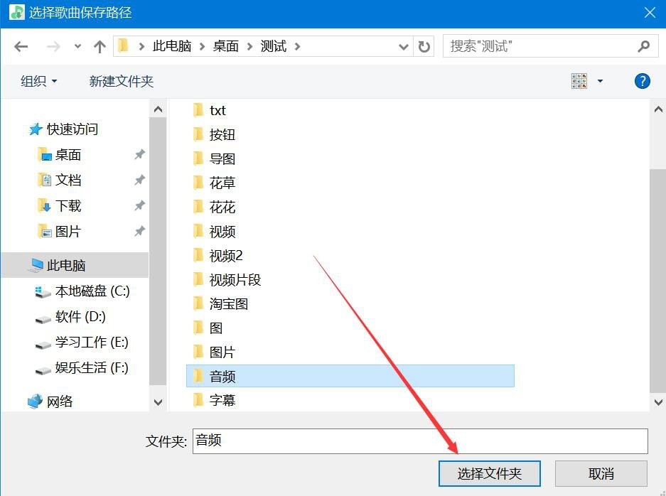 选择歌曲下载后的保存路径,再点击"选择文件夹"按钮。