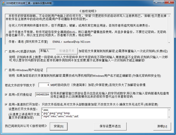 本软件采用密码分段输入的方式,使用了多重算法交叉加密(类如RSA,RC6,AES这样的国际知名标准加密算法,用了3种以上,私房的加密算法,用了3种以上,所以对每个文件加密总层数大于6层)软件界面简陋,注重实用,尤其注重安全强度,即便软件设计者本人也无法解密,用户切记抄记好密码,并多做加密后的文件备份。本软件绝无后门,也无任何后台联线和数据发送,请大家放心使用。
