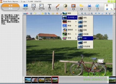 ⊙艺术化效果可以将相片转换成戏剧化的作品,包括:色调、炭笔、彩色笔、皱纹、织物、油画、铅笔和水彩。