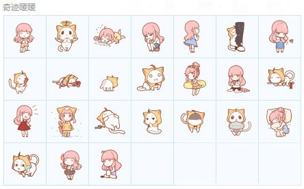 奇迹暖暖qq表情包24P是同名游戏里的主人公“暖暖”的一个表情包,这是一个非常可爱的qq表情系列,粉色齐刘海长发的暖暖要加入你们的聊天啦,包括哭泣、大笑、猫咪、睡觉、开心、失落等,欢迎下载使用。