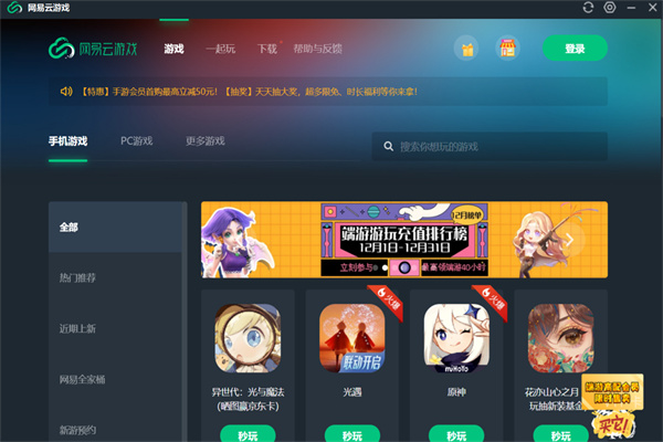 网易云游戏pc端是一个可以在电脑上运行的云游戏平台。可以实现手机、电脑、tv三端账号互通,推送了海量比较热门的游戏资源,像:原神、光遇、阴阳师等等。玩家们无需下载安装就可以在线免费试玩各类网游。想要体验的玩家欢迎体验。