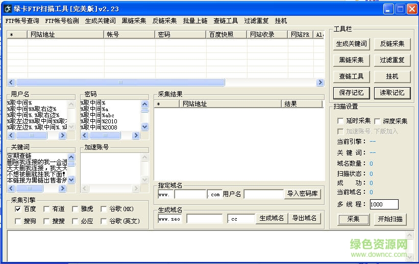 5.绿卡FTP全自动挂机版2000超强线程,24小时稳定挂机扫描,自动更换关联词,目前网络上最快的软件,不死线程,电脑或服务器挂机最佳选择