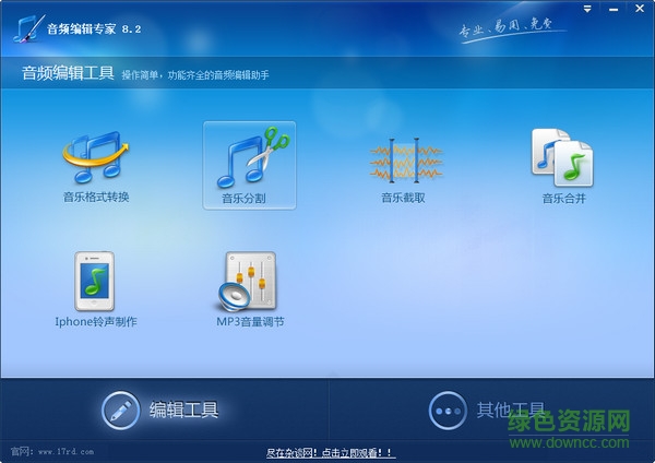 音频编辑专家这款软件是一款适合初级用户的音频编辑工具,它的功能很强大,你可以通过它进行音乐格式转换、音乐分割、音乐截取、音乐合并、iphone铃声制作、MP3音量调整,并且还支持对视频中的音频进行编辑,可以说一款软件结合了数款软件的功能,软件很容易上手,有兴趣编辑音频的朋友可以下载使用。有需要的就来绿色资源网下载试玩吧!