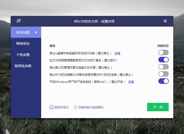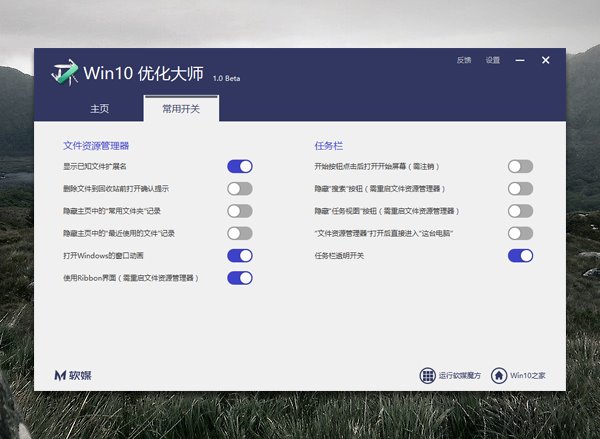 Win10优化大师1.0 Beta版内置经典 “常用开关”功能,无论是隐藏浏览记录,还是点击资源管理器按钮直接打开“这台电脑”,甚至是任务栏透明设置等操作,有Win10优化大师,轻松搞定。忘掉修改注册表的那些复杂流程吧,享受Win10优化大师极简操作带来的快感!
