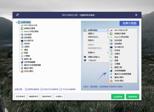 • 右键菜单快捷组功能:只需要在桌面上单击右键,就可以打开常用程序、进行关机重启操作了!