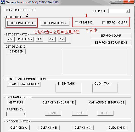 6:打开在本站下载的佳能I250/255/355I清零软件。点击软件界面里面的GeneralTool图标。接着在出现的程序窗口usbport项中选择该打印机所对应的USB端口。选取要清零的机型,在下面的cleaning 和EPROM项前打勾,点击test 1按钮。打印机电源灯闪动一下,机器已清零重新开机可以继续使用了。
