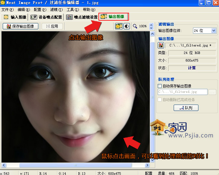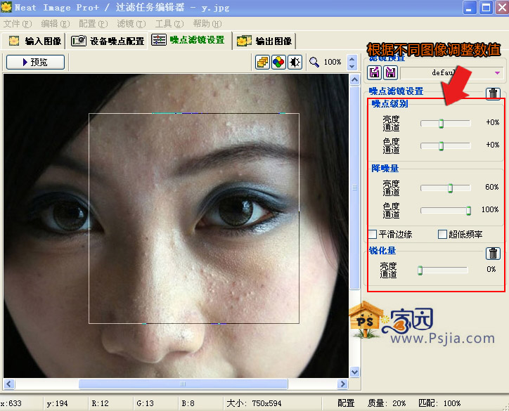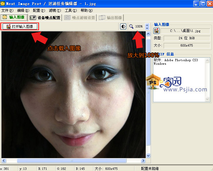 第二步,我们打开NEAT IMAGE滤镜,载入PS里处理好的图片。并放大到100%,以便容易观看效果!