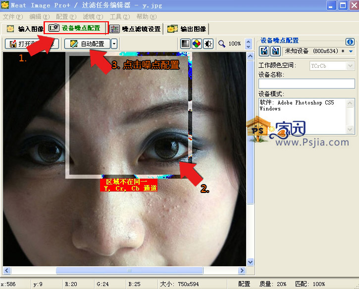 第三步,点击设备噪点配置,然后在照片上拖选出一个框,再点击自动配置(注意:拖选时要选中皮肤,以便自动配置)