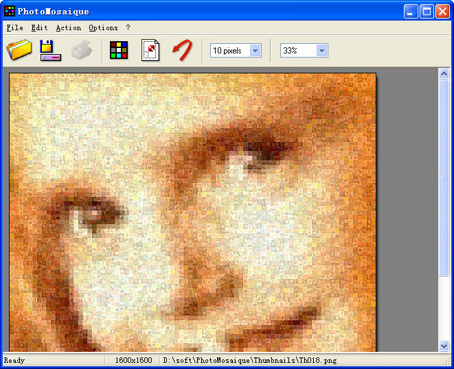 在PhotoMosaique中打开一张图片,然后按工具栏第四个按钮Create the mosaic即可快速完成马赛克效果!