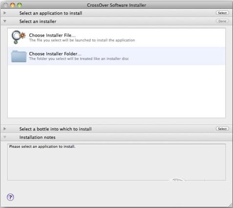 打开 Finder,把腾讯通 RTX 所需要的必须文件(本文最后会给出下载)放到 “你的用户/Library/Application Support/CrossOver/Bottles/你的bottle名字/drive_c/” 路径下。然后打开 Crossover,选择 “Configuer-Install Software”。在这个窗口选择 “Select an installer”,在 “Choose Installer Folder” 下面选择你的腾讯通 RTX 安装包。