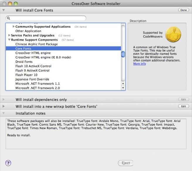 在第一项的 “Select an application to install” 上选择 “Core Fonts”,随后你可以把你 Windows 的字体文件全都拉过来去修文字乱码这个 Bug。