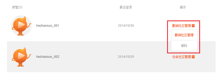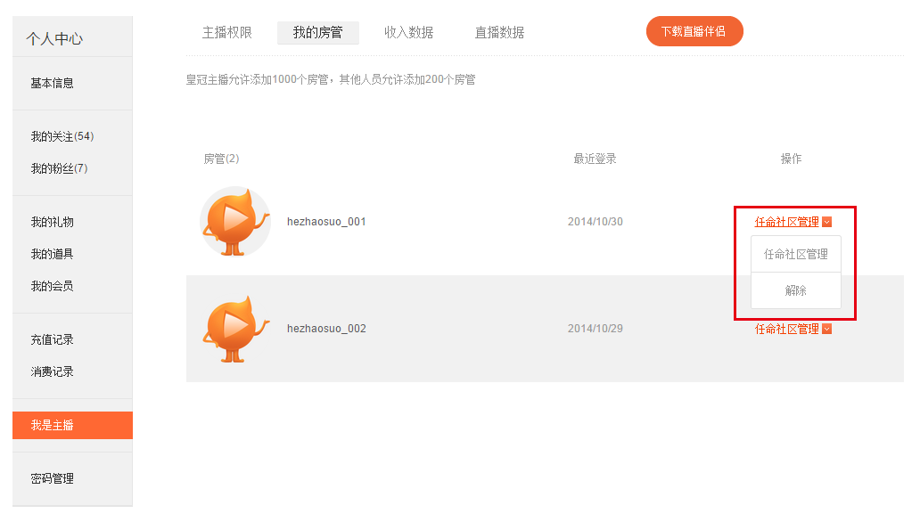 主播在“我是主播/我的房管”页面中,可以将直播间房管任命为社区管理员,也可以将社区管理员撤销。