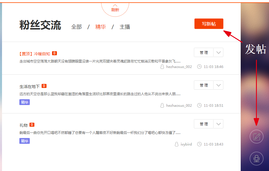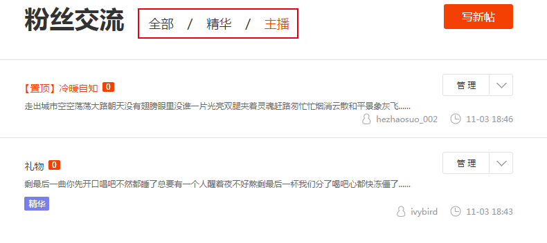 针对主播个人页的帖子主播和社区管理员具有如下权限(鼠标悬浮于帖子右边【管理】按钮即可浮出):