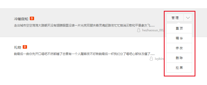 主播和社区管理员对主播个人页的帖子具有相同的管理权限,包括:置顶,精华,修改,删除,拉黑。