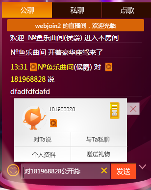 聊天分为公聊和私聊两种,其中私聊是限制富豪等级在3富以上的用户才能使用。