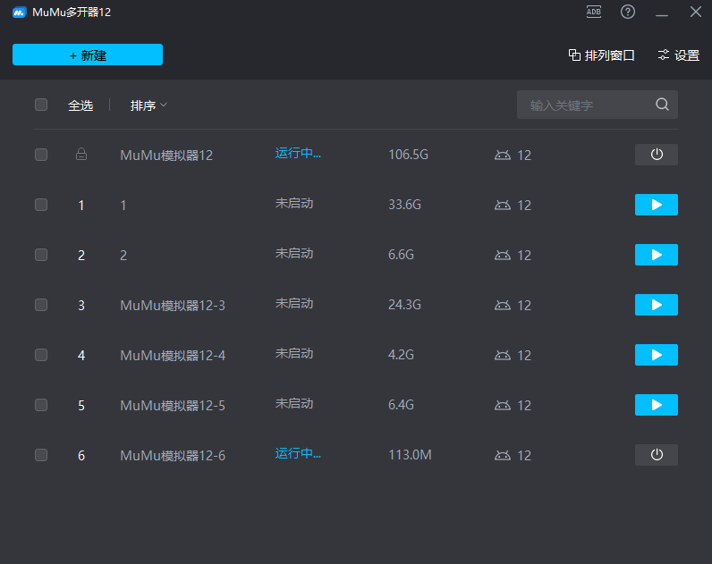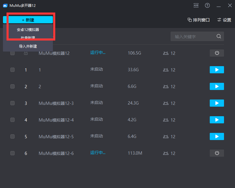 第二步,进行模拟器多开操作,可点击模拟器右上角的新建-选择“安卓12模拟器”即可快速新建模拟器;