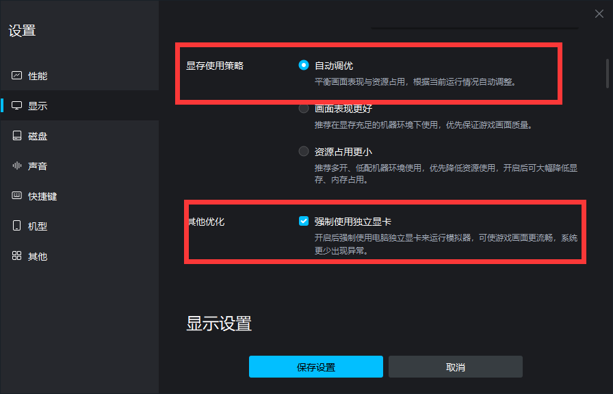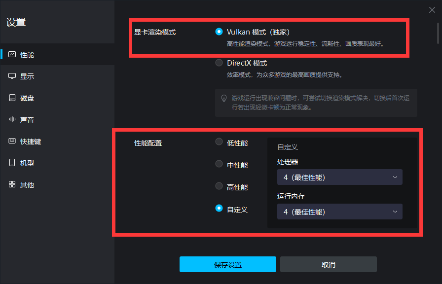 点击模拟器右上角菜单-设置中心,点开性能设置界面,显卡渲染模式选择Vulkan模式,将性能设置调整到4核4G及以上设置,再将显存使用策略调整到自动调优,并勾选强制使用独立显卡功能。