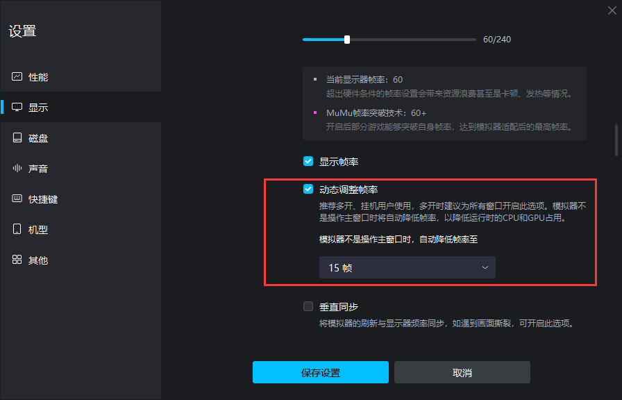 点击模拟器右上角-设置中心-显示设置-勾选“动态调整帧率”,可根据自身需求调整多开窗口的帧率,提高模拟器运行效率。