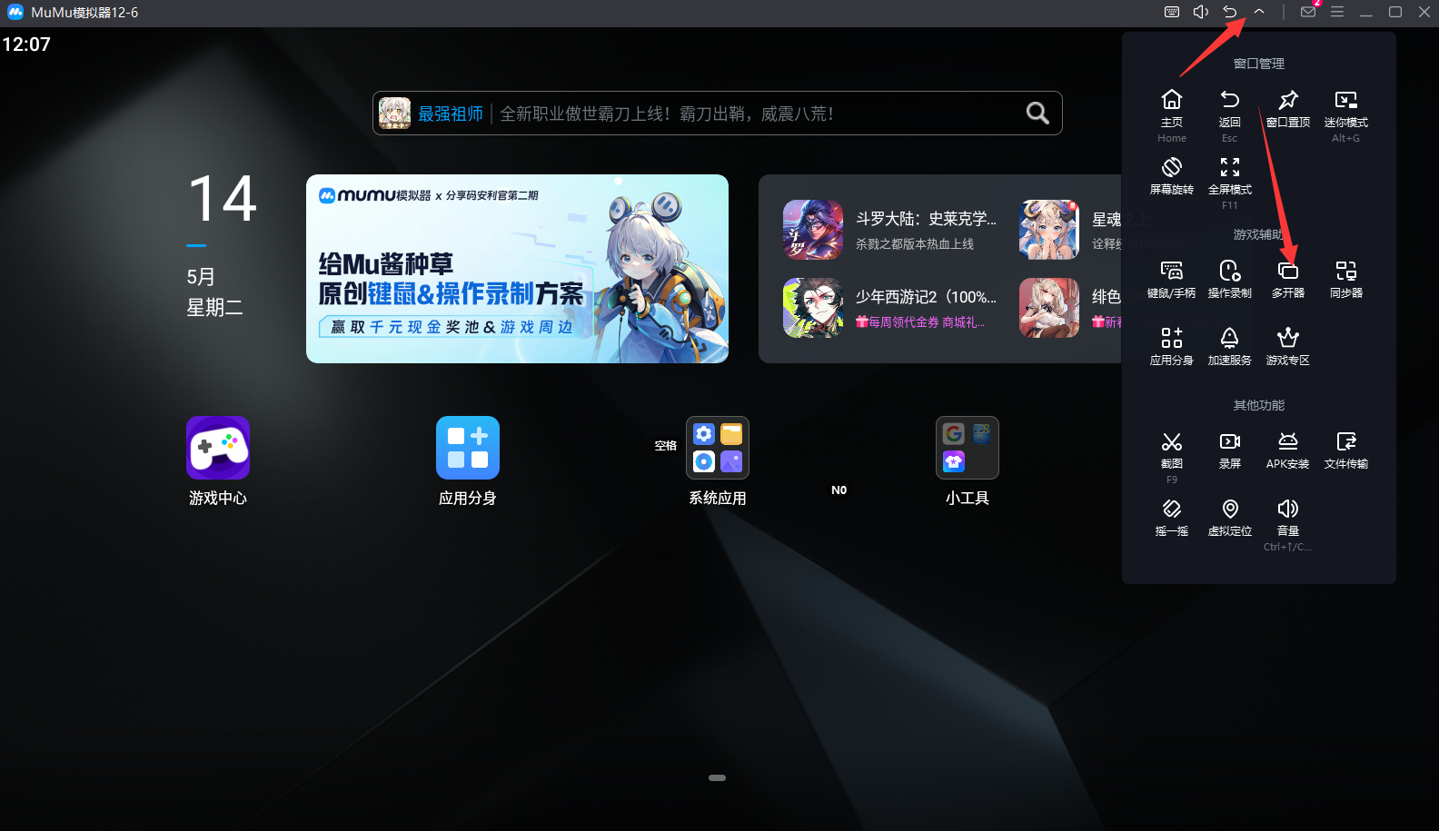 第一步,点击模拟器右上角“V”功能菜单,找到并点击多开器,打开多开器界面(也可通过电脑桌面的MuMu多开器12图标快捷启动多开器);