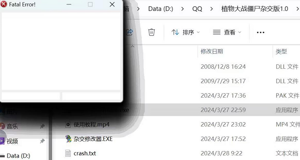 处理建议:群文件内查找【修复】Fatal Error报错.reg文件,下载下来运行即可清除错误,出现此问题时,不建议开启全屏游戏。