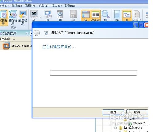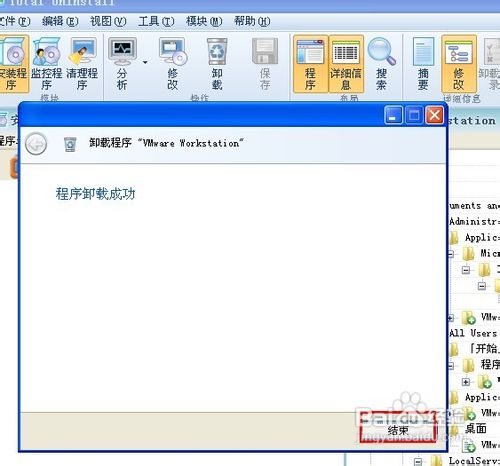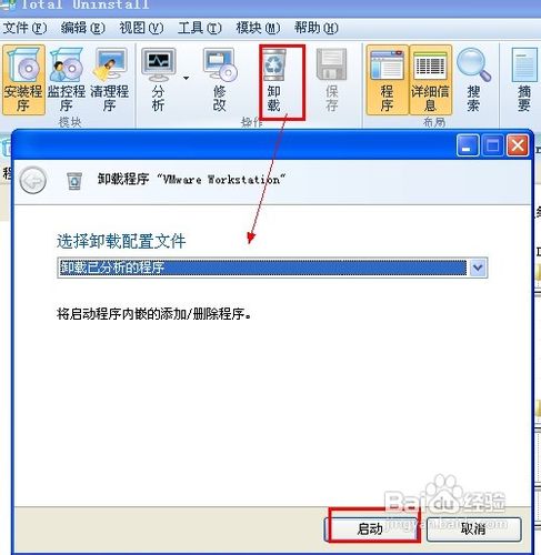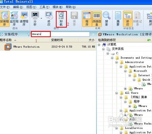1、打开Total Uninstall启动时,在对话框中点击“安装程序”输入vmware,刚找到它点击“卸载” ,如图