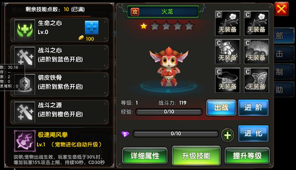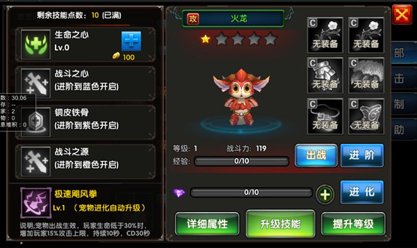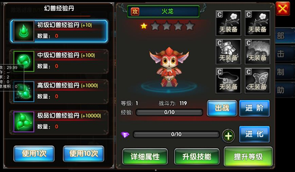 当幻宠右边的装备穿齐一套时,点击进阶按钮,幻宠就可以进阶到下一品质,此时幻兽的属性能得到大幅度提升