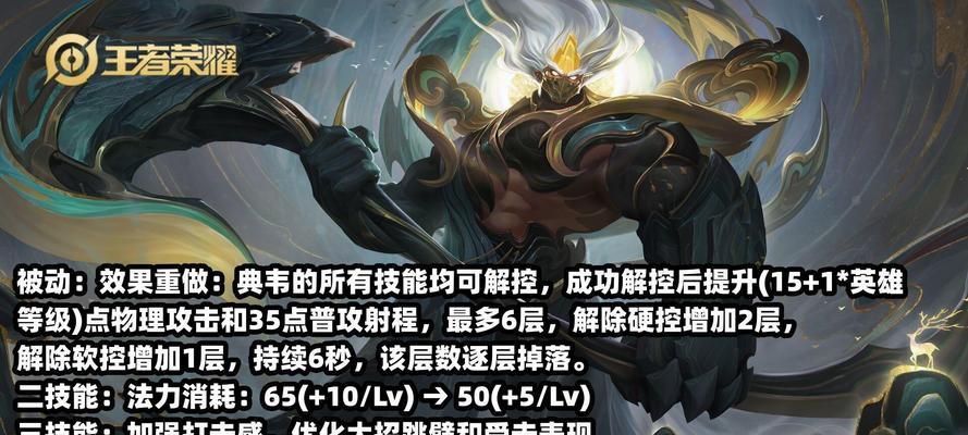 作为王者荣耀中的重装战士,典韦无疑是一名非常出色的英雄。在游戏中,选择适合的出装可以让典韦的战斗力得到极大提升。本文将为大家介绍一套针对典韦的出装攻略,帮助玩家们更好地利用典韦在战场上威震八荒。