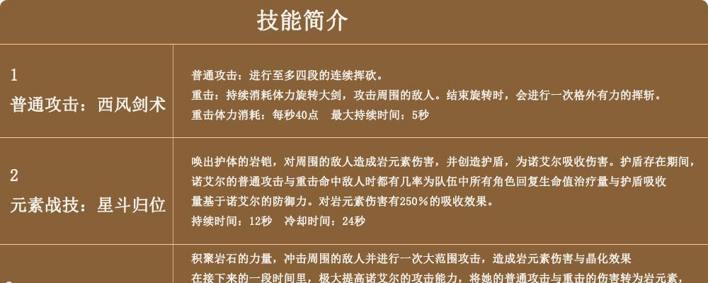 在《原神》这款受欢迎的开放世界游戏中,诺艾尔作为一名重击战士,以其出色的防御和强大的爆发伤害能力,成为了许多玩家喜爱的角色。本文将为大家详细解析诺艾尔的出装攻略,帮助玩家们了解最佳装备选择,使诺艾尔在战斗中发挥出最大的潜力。