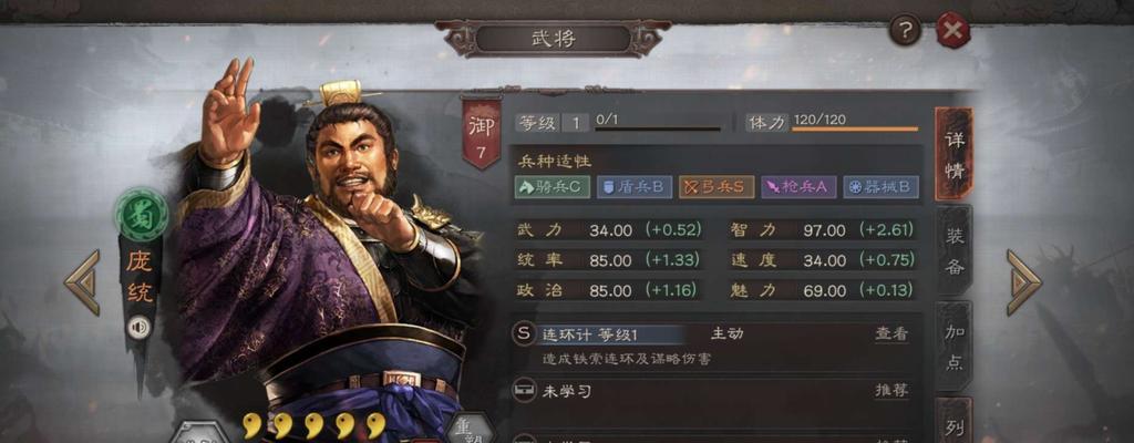 3.徐庶的兵种适应性:徐庶最适合搭配弓兵,因为他可以提高全队防御,并且有一定几率使敌方武将攻击失误。