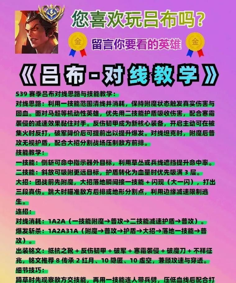 十五、合理选择吕布的装备可以提升他的生存能力、输出能力和爆发能力,使他在战场上成为一名无敌的好家伙。希望本文能够给大家带来对吕布出装攻略的全面了解,帮助大家在游戏中更好地使用这位英雄,取得更多的胜利!