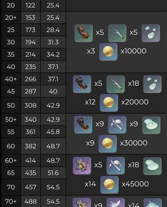 除了突破材料外,米卡还需要加成材料来提升属性。以下是各等级米卡所需的加成材料: