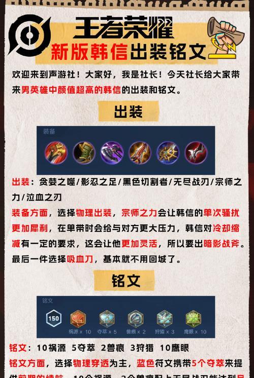作为《王者荣耀》中的一位英雄角色,李信凭借其高爆发和机动性备受玩家们的喜爱。然而,要想在游戏中发挥出李信的最大潜力,我们需要对他的出装和铭文进行正确的搭配和选择。本文将深入探讨李信的教学出装与铭文攻略,帮助玩家们在战场上成为绝对强者。