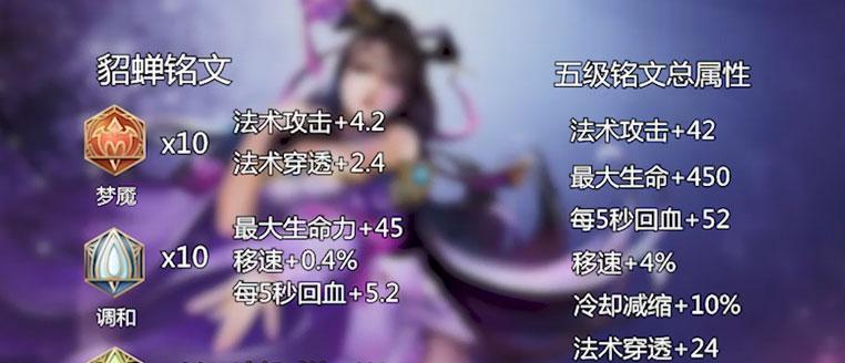 在青铜级别下,我们可以通过选择适合自己的铭文搭配来提升貂蝉的技能伤害和生存能力。比如选择法师天赋,提升技能伤害,并搭配魔法吸血铭文以增加生存能力。